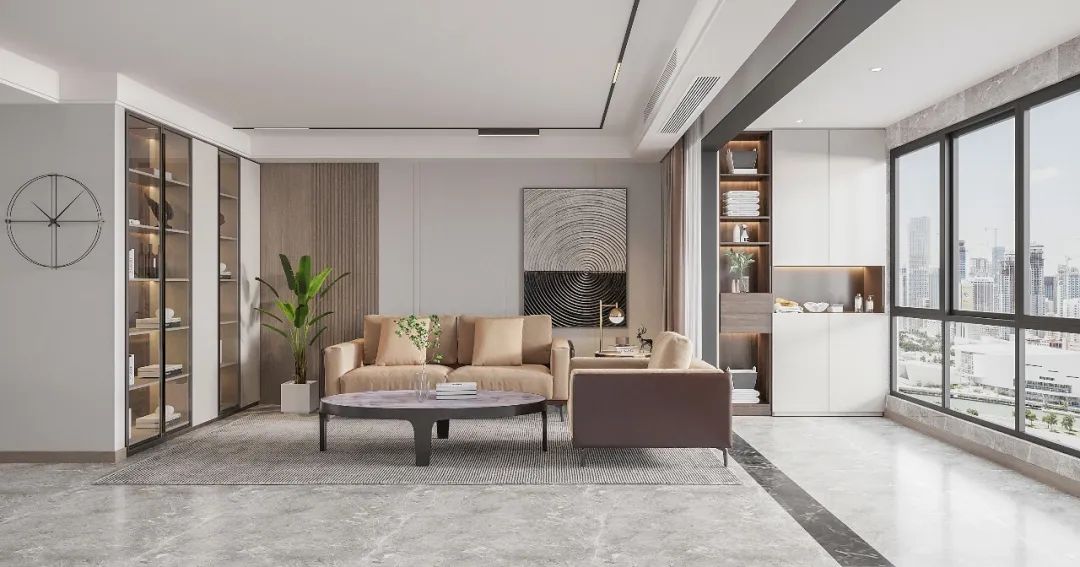 客廳光線(xiàn)極佳,爲(wei)了(le)不浪費良好采光,同時也(ye)滿足鄒女士簡單(dan)生(sheng)活的(de)需求,客廳沒有(yǒu)過(guo)多(duo)繁複裝(zhuang)飾,整體(ti)以(yi)白色爲(wei)基調,搭配(pei)淺駝色皮沙髮(fa),低調有(yǒu)質(zhi)感。(YOYO小(xiǎo)提示~爲(wei)了(le)更好展(zhan)示客廳空間,畫面中(zhong)就暫時先(xian)将玄關隐去了(le)哦~)整牆定製(zhi)電(dian)視櫃“內(nei)有(yǒu)乾坤”,容量豐(feng)富(fu),極簡設(shè)計(ji),線(xiàn)條幹練流暢,無把手櫃們(men)視覺統一(yi),櫃體(ti)更顯輕盈;底部(bu)留空設(shè)計(ji)打消了(le)整牆電(dian)視櫃帶來的(de)壓迫沉悶感,內(nei)置燈帶讓客廳更顯靈(ling)動(dòng)高(gao)級。